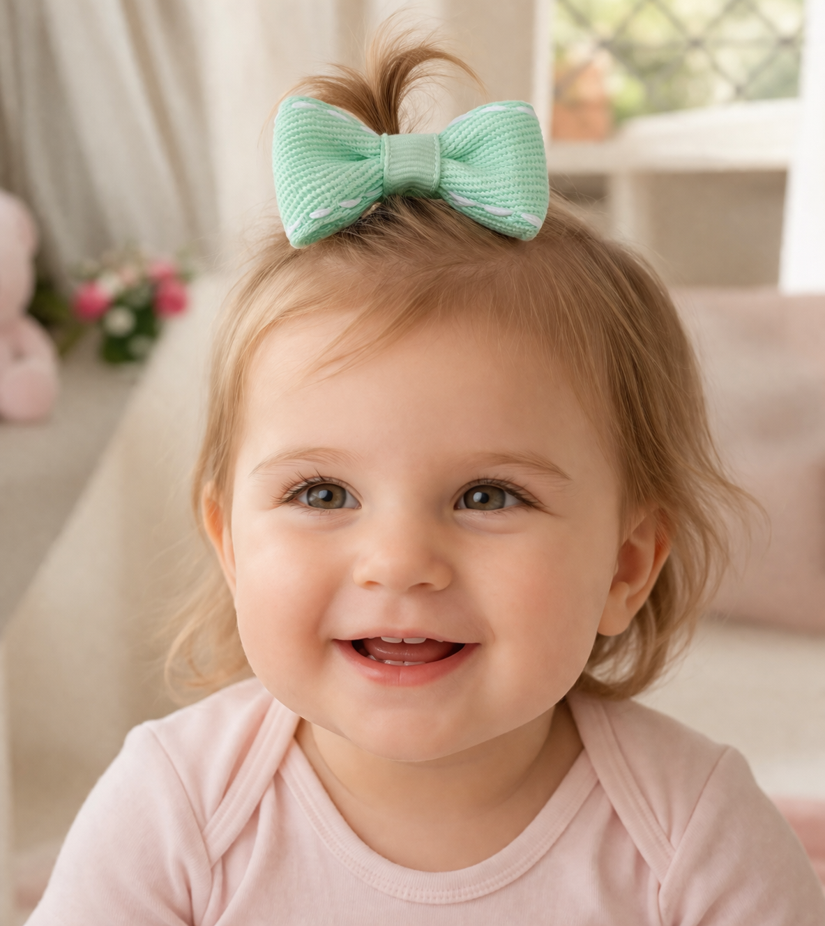 Aplicados na base de bico, não aperta nem machuca a cabecinha da criança, kit acompanha 5 unidades, cores da foto.